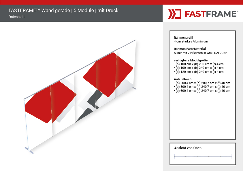 Der FASTFRAME™ gerade Wand mit 5 Modulen ist die ideale Lösung für professionelle Präsentationen, Messen und Events. Dank seines leichten, vormontierten Aluminiumrahmens mit 40 mm Profil lässt er sich in Sekundenschnelle aufstellen – ganz ohne Werkzeug. Eine zentrale Stützstange sorgt für zusätzliche Stabilität, während optionale Standfüße den Halt optimieren.